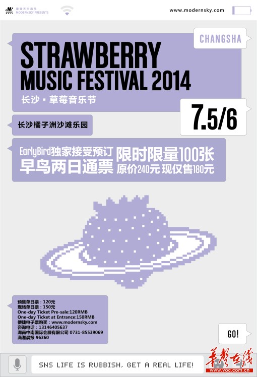 自从2009年“草莓音乐节”创办以来,每年去草莓撒欢已经成为年轻人的首选。对比之“摩登天空音乐节”,“草莓”的气质更为多元,5年以来,“草莓音乐节”走过北京、上海、武汉、长春等城市,虽然,这是“草莓音乐节”第一次来到长沙,但星城乐迷对激情、浪漫、嬉皮、性感——“草莓音乐节”这一国内响当当的音乐节品牌早已了然于胸。