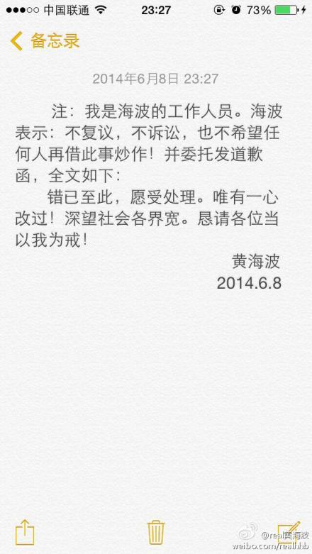 注:我是黄海波的工作人员。海波表示:不复议,不诉讼,也不希望任何人在借此事炒作!并委托发道歉函,全文如下:错已至此,愿受处理。唯有一心改过!深望社会各界宽。恳请各位当以我为戒!
