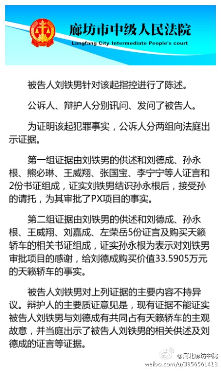 据河北省廊坊市中级人民法院官方微博消息,10时01分,法庭对起诉书指控刘铁男收受孙永根天籁轿车的事实进行调查。公诉人证据显示,刘铁男结识孙永根后,接受其请托为其审批了PX项目,孙为表示感谢,为其子刘德成购买了价值33.5905万元的天籁轿车。