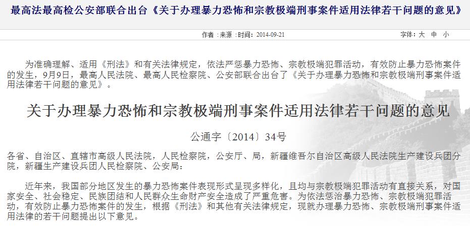中国网9月21日讯 据公安部网站消息,为准确理解、适用《刑法》和有关法律规定,依法严惩暴力恐怖、宗教极端犯罪活动,有效防止暴力恐怖案件的发生,9月9日,最高人民法院、最高人民检察院、公安部联合出台了《关于办理暴力恐怖和宗教极端刑事案件适用法律若干问题的意见》。