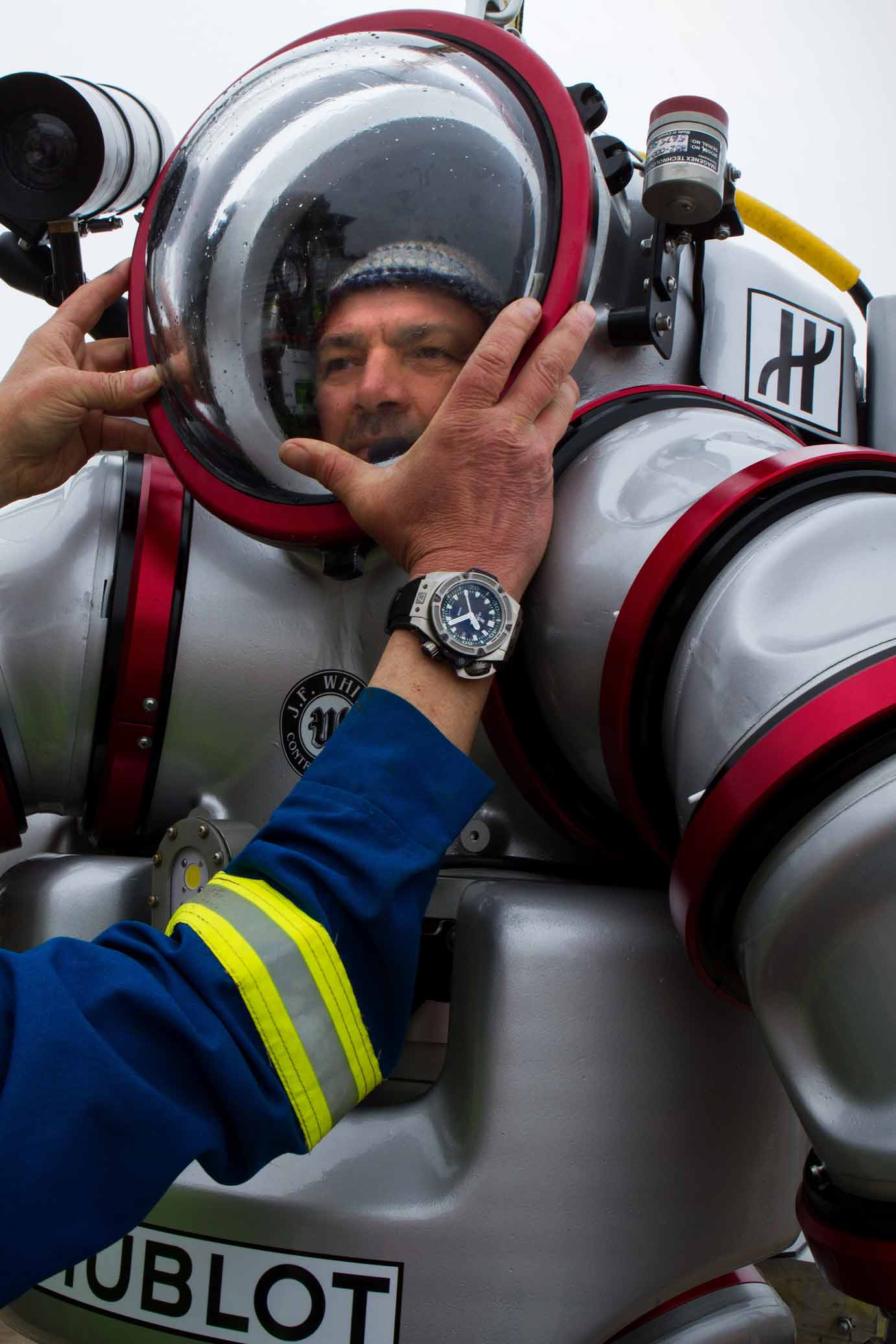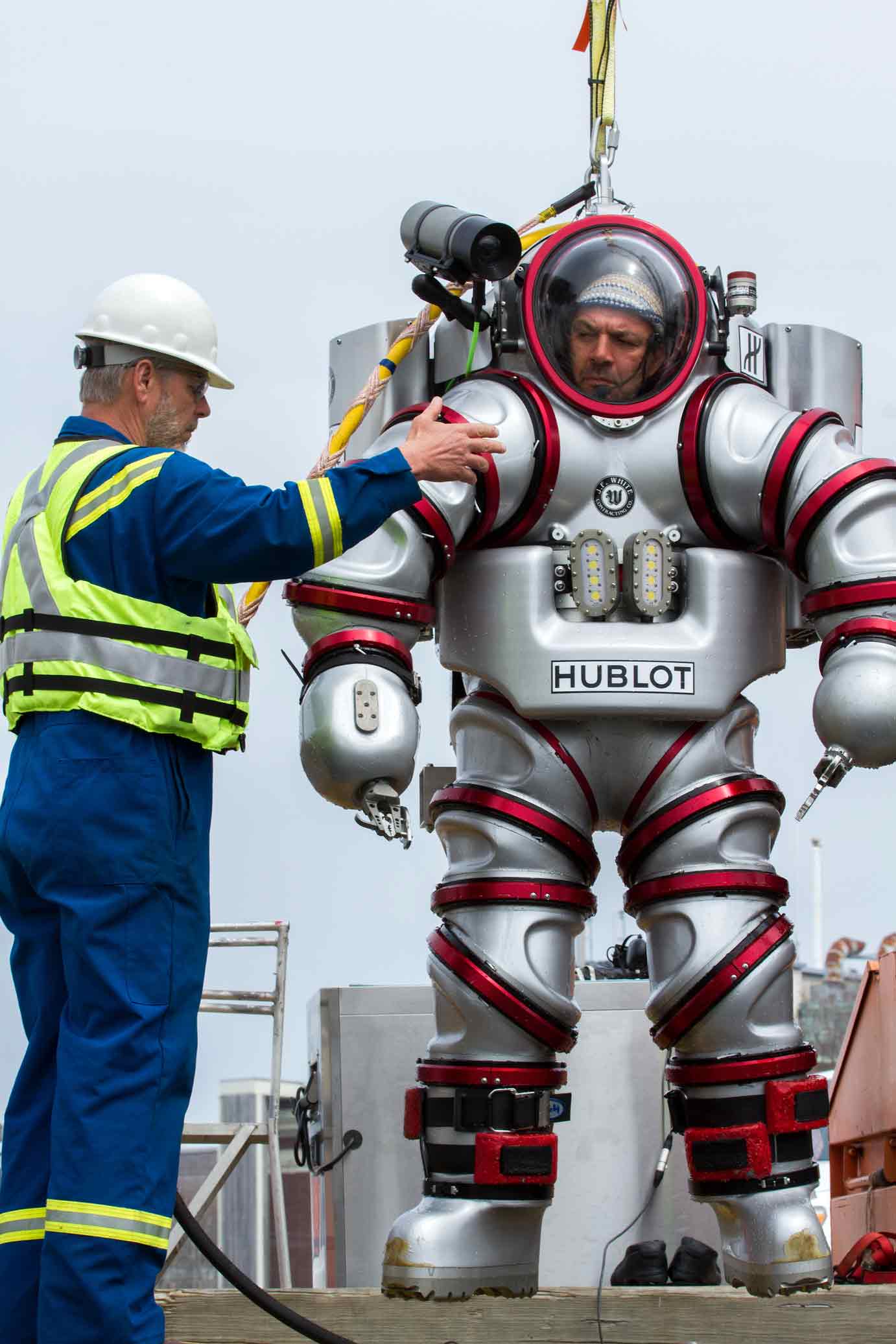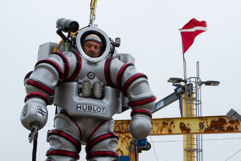 这套潜水服价值超过1百万欧元。人们身着这套潜水服可以潜至300米深的海水之中,停留50小时。(图片来源:法新社)