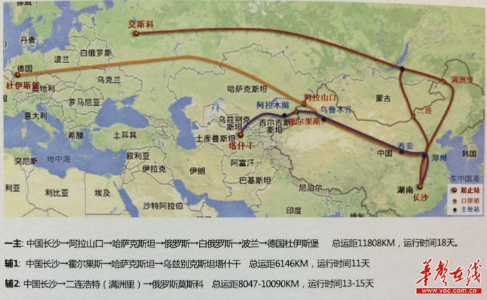 徐双荣介绍,“湘欧快线”总体规划为“一主两辅”。其中,“一主”为长沙-德国杜伊斯堡,通过新疆阿拉山口出境,途经哈萨克斯坦、俄罗斯、白俄罗斯、波兰、德国,全程11808公里,运行时间18天,定于10月30日首发;“两辅”一是经新疆霍尔果斯出境,最终抵达乌兹别克斯坦的塔什干,全程6146公里,运行时间11天;另一条经二连浩特(或满洲里)出境后,到达俄罗斯莫斯科,全程8047公里(或10090公里),运行时间13天(或15天),计划11月中下旬开行。2015年,初步计划每10天开行一班,基本实现常态化运行。