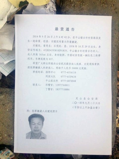 经警方调查,嫌犯锁定为平山镇古朴村村民石某某,并在距离案发地约10公里的佛子镇泗洲村委西乡水村背后的平岭岗路边发现了疑犯丢弃的摩托车。当天,公安部门从南宁、玉林、贵港、钦州等地调集600多名警力,先后组织2000多名干警和群众合力围捕嫌犯。警方还发布10万元悬赏通告,向社会征集抓捕嫌犯线索。