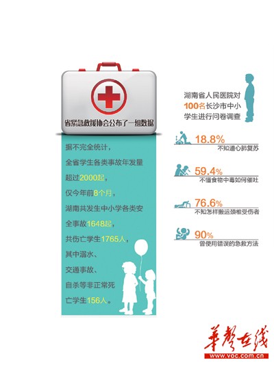 今年7月,湖南省人民医院对100名长沙市中小学生进行问卷调查的结果显示:18.8%不知道心肺复苏;59.4%不懂食物中毒如何催吐;76.6%不知怎样搬运颈椎受伤者;90%曾使用错误的急救方法。