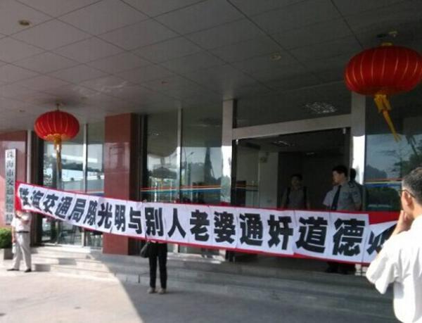 横幅。日前,珠海市道路运输管理处培训科科长陈光明被文某的丈夫温某发网帖实名举报。