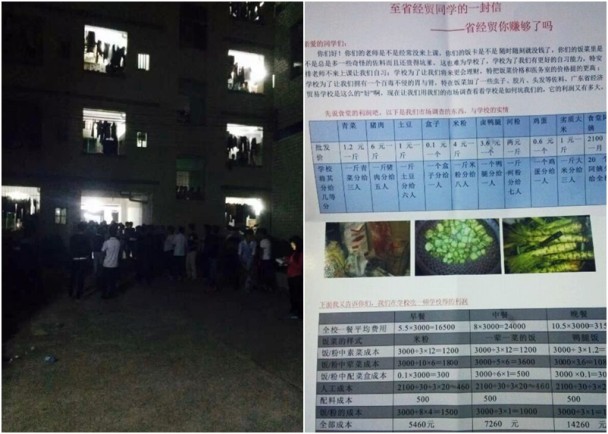另据港媒报道,因学校食堂饭菜价钱高质量差,以及宿舍用电出现安全问题,广东省经济贸易职业技术学院人和校区3000学生11月4日集体示威,砸食堂、小卖部、机房、门窗、空调,放火,并群殴校长。