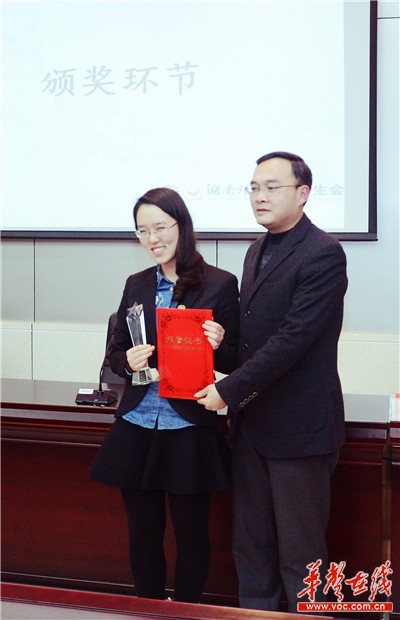最佳辩手李梦琪(左)代表湖南师大接过冠军奖杯。 李毅 摄