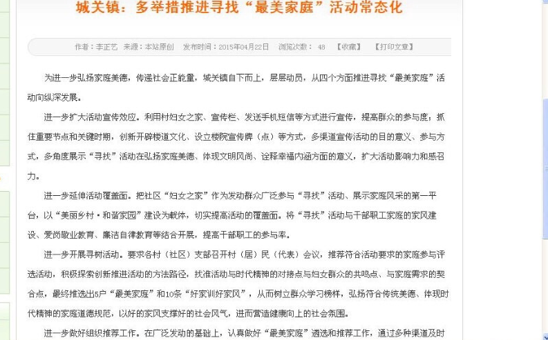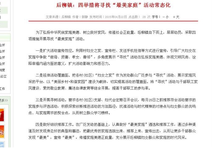《城关镇:多举措推进寻找“最美家庭”活动常态化》、《后柳镇:四举措将寻找“最美家庭”活动常态化》,“开始我还以为是眼睛花了,仔细一看除了镇名不一样,标题、工作内容、举措几乎雷同,是每个镇的工作情况类似到可以互相借鉴的地步?还是政府工作人员纯粹为了偷懒?”4月26日上午11时许,一网友爆料称,石泉县政府网站上各镇快讯栏目中,一篇来源为后柳镇的稿件,内容竟然与白河县城关镇一篇政府工作稿件,除了来源、作者和第一段话不一样外,其他内容几乎一模一样。随后该网友网上搜索发现,该政府网站上有3篇来源为石泉县后柳镇的稿件,与来源为紫阳县焕古镇、白河县城关镇、庄浪县朱店镇的稿件几乎雷同,且后柳镇稿件发布时间也比其他镇晚。
