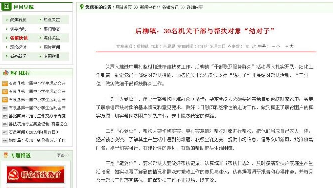 4月27日上午10时,华商报记者来到石泉县信息中心,据该中心主任胡德辉介绍,政府网站上的各镇快讯栏目是由各镇政府工作人员供稿,内容基本上是本镇的一些最新工作动态,他们只负责审核更新。对于华商报记者询问的政府网站上后柳镇发来的几个稿子与其他网站雷同一事,胡德辉表示确有此事。