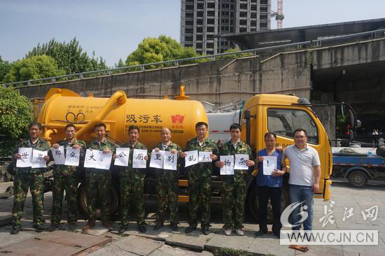 作业完毕后,武昌区城管委厕管站的7为疏捞工们手举标语“世界那么大,公厕里别乱扔杂物!”发起微心愿,呼吁大家文明如厕,不要乱丢杂物,随身物件小心看管,以免遗落公厕管道内,造成管道堵塞。