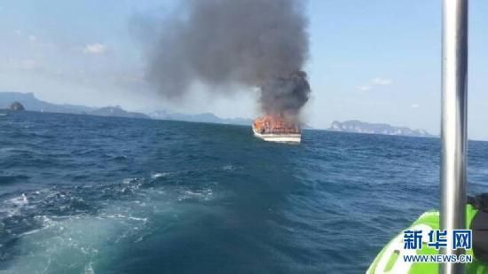 4月8日,在泰国甲米与普吉之间海域,发生起火事故的游船冒起浓烟(手机照片)。图片来源:新华网