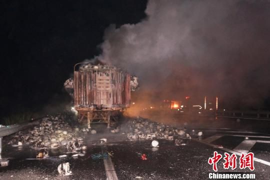中新网北海5月11日电(陈燕 杜忠 李海华)一辆从广东开往云南昆明的拖车,11日凌晨行驶至兰海高速广西合浦石湾路段时,车厢左侧轮胎突然爆胎起火,致该车上近千个电饭锅和80桶液压油过火。
