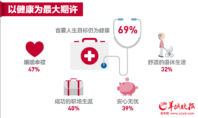 在预期将会改善的因素方面,“资产价值”、“可支配资金”和“家庭生活”位列中国内地中产阶级的前三选择,然而,他们对“健康”、“休闲可用时间”、“居住地周围环境”的改善信心度较低。高达接近七成(69%)的中国内地中产阶级把健康列为首要人生目标,随后才是“愉快的婚姻或关系” (47%)、“成功的职场生涯” (40%)。