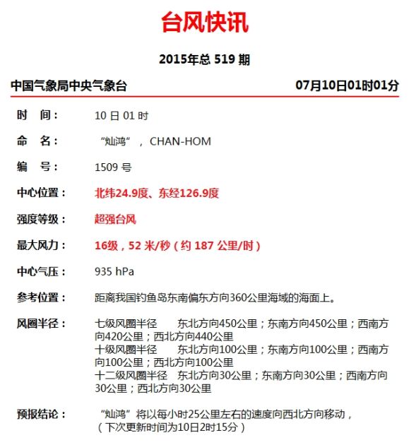 据中央气象台23时20分发布:09日23时,今年九号台风“灿鸿”中心位置位于距离我国钓鱼岛东南偏东方向395公里海域的海面上,最大风力16级,52 米/秒(约187 公里/时),强度等级为超强台风,预计“灿鸿”将以每小时25公里的速度向西北偏西方向移动。