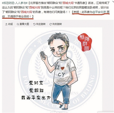 8月20日,北京警方通过官方微博“平安北京”推出民警原创设计的“朝阳群众”和“西城大妈”卡通形象,并制作卡通形象文化衫,与反恐宣传品一起赠送给积极参加活动的热心网友。