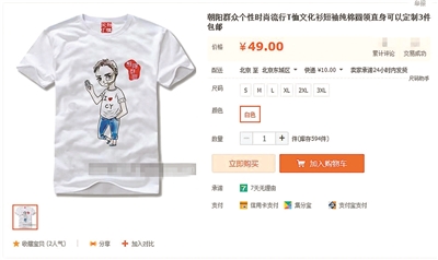 北青报记者随后在淘宝网搜索发现,仅有一家网店出售这种T恤衫。店铺简介上显示,店铺所在地为北京,开店时间为2008年。记者在售卖信息上看到,“朝阳群众(西城大妈)个性时尚流行T恤文化衫短袖纯棉圆领直身可以定制3件包邮”,印花图案与@平安北京此前公布的动漫形象一致,单件售价为49元。