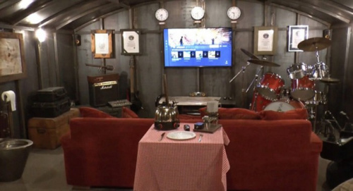 报道称,今年36岁的科林弗兹之前是一名管道工,他说自己从小就渴望拥有一个秘密基地。因此,他花费了两个月的时间,在自家的后花园下面修建了一座16英尺宽(约4.88米),20英尺长(约6.1米)的人造洞穴。这个宽敞的小屋内陈设有厨房、聚会区、平板电视、沙发、鼓乐器、游戏机,弹射床,应尽应有。