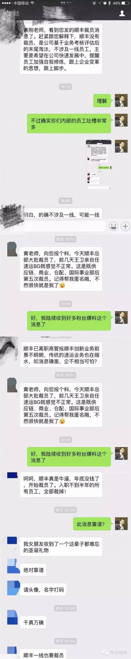 据消息,顺丰内部员工的爆料称顺丰总部开大批裁员,说前几天顺丰总裁王卫亲自任顺丰速运BG,这是既供应链、商业、仓配、国际事业部后第5次裁员。也有顺丰一线女员工爆料称,“顺丰怎么可能裁员,他是逼你自动辞职”。