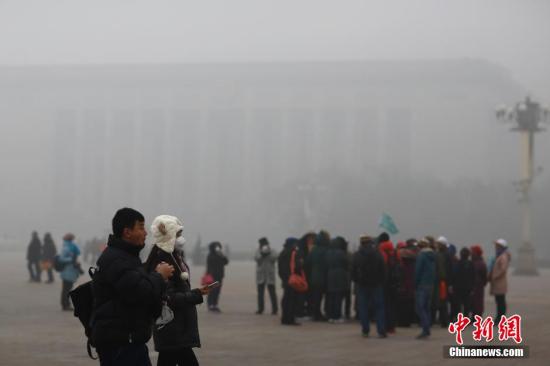 12月1日,游客在雾霾中的天安门游览。当日,北京市区陷入重度雾霾,能见度极差。从11月27日开始,发生在华北地区的这轮大范围严重污染过程,已持续4天,为今年以来最严重的污染过程。 中新社记者 盛佳鹏 摄