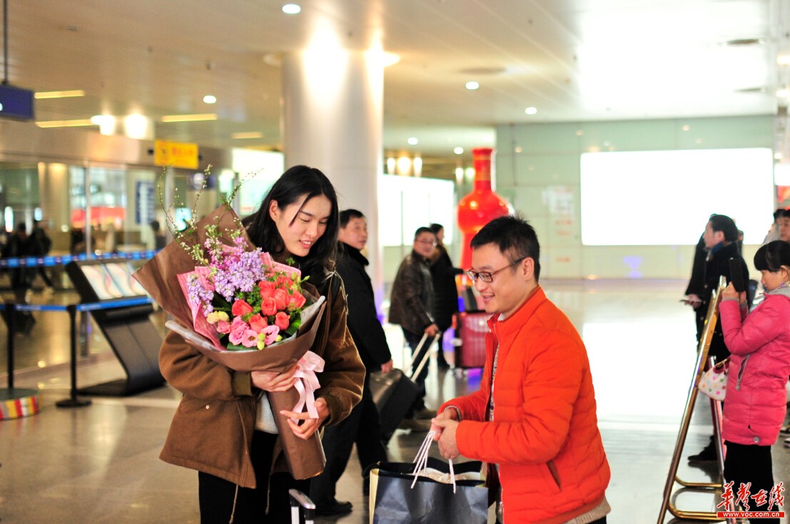 新丝路全国冠军陈智从成都载誉而归,华声全媒体团队在长沙黄花机场欢迎。 童迪 摄.