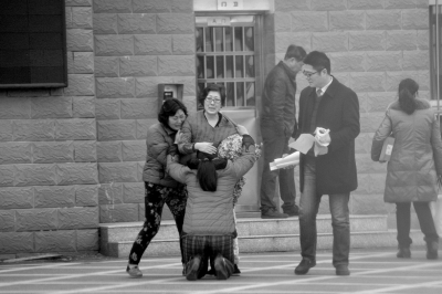 ▲孩子的生母下跪说对不起。 京华时报记者谭青摄