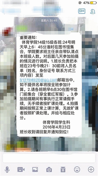一位学生向北青报记者展示了一份校方工作人员通过QQ所发通知的截屏,该通知落款为体育学院学生科,通知中称,体育学院14级、15级各班24日早6点30分在图书馆门前集合,穿全套红军服,参加拍摄期间有事执行正常请假手续,无手续者按旷课处理,给予相应处分。