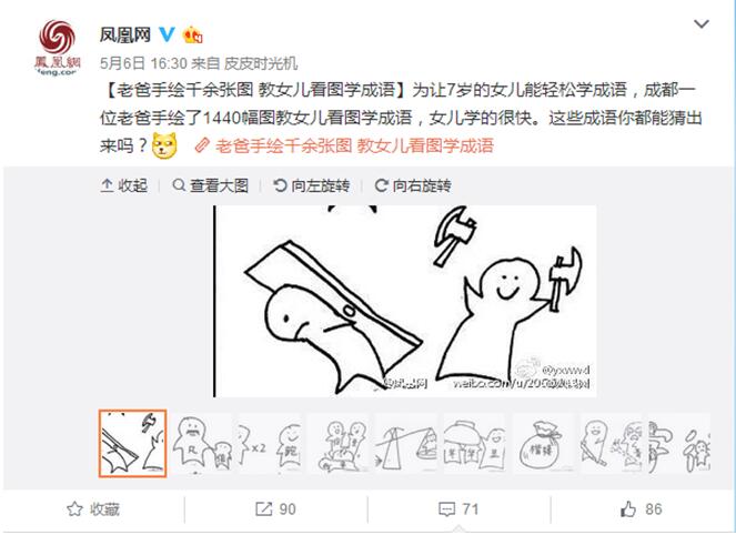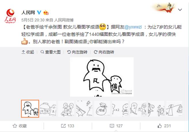 四川新闻网成都5月9日讯(记者 陈淋)愚公移山、凡夫俗子、纷至沓来、踉踉跄跄、称王称霸……当这些成语变成有趣的漫画形式,是不是很有趣?让人一下就记住了。近日,成都便有这样一位巧手爸爸,为了教7岁女儿学成语,自己手绘了1440幅漫画,它的漫画作品被朋友上传到微博后,随即被人民网、凤凰网、四川新闻网、扬子晚报、重庆日报等多个官方微博转载,引发网友热烈讨论,并掀起一轮猜成语热潮。这位爸爸俨然已成为新一代“网红”,他也被网友亲切地称为“漫画爸爸”。