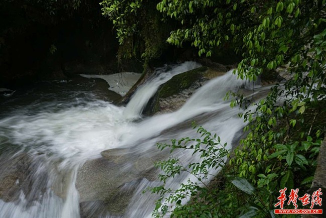 穿过吓通村,随处可见用于制作黑笋干的压笋箱,整个村子里都弥漫着一股清香。沿着一条羊肠小道,直达山林脚下。入口处,一条清澈的小溪顺着山势缓缓地流淌下来,沿着蜿蜒的亲水栈道前行,四周枝繁叶茂,恰逢雨后,更是青翠欲滴。