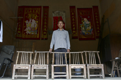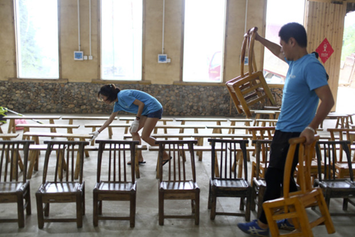 会场内外的东西渐渐齐全,可空旷的厂房里连一个坐的地方都没有——于是六十多把板凳从52岁的徐漫辉家,50岁的唐武家,83岁的周桂英家一一借来。