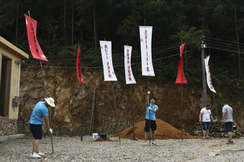 借到了场地,这些陌生人开始向村民们借起了村里的各种东西。村里用来晒稻谷的一面大席子,被他们借去整理了一下用作会议的背景板。