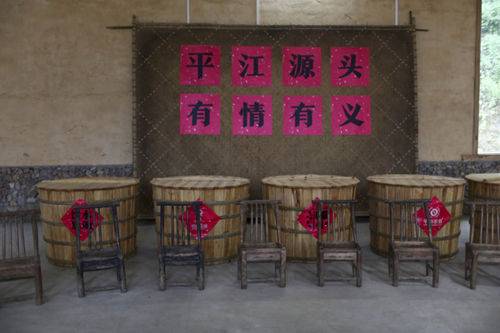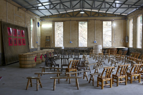 即将开会的酒厂位于村中一个山腰处,背靠满是竹林的一座翠绿山峰,面前则是一排同样翠绿的山田和池塘。说是酒厂,其实就是一间一千多平方的大厂房。几周前,有人找到酒厂的老板唐武光,说是希望借他的酒厂开个会,这对唐武光来说显然是个新鲜和有趣的事情,他并没有拒绝。借东西的人随即得寸进尺,又把酒厂里四个高和长都超过一米的大酒缸一并借去。