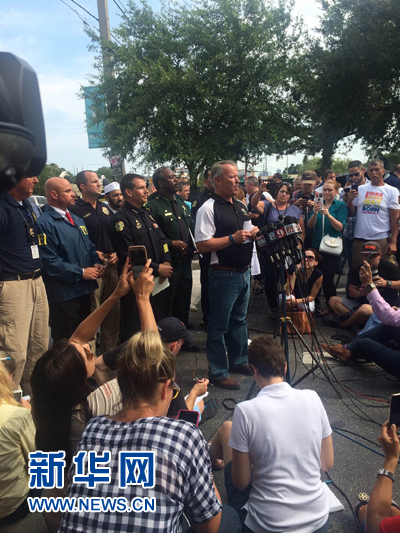 6月12日,在美国佛罗里达州奥兰多市,奥兰多市市长巴迪·戴尔(中)就枪击案出席新闻发布会。美国佛罗里达州奥兰多市市长12日宣布,该市当天凌晨发生的夜总会枪击案已致50人死亡、53人受伤。 新华社发(奥兰多警察局供图)