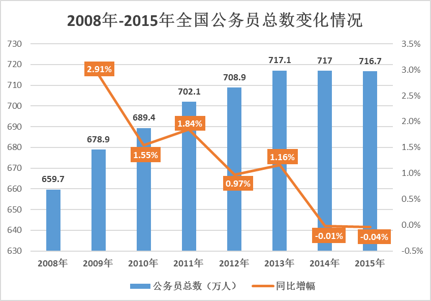 2008年至2015年全国公务员总数,分别为659.7万人、678.9万人、689.4万人、702.1万人、708.9万人、717.1万人、717万人和716.7万人,这一数字在2014年和2015年已经连续2年微幅下降。