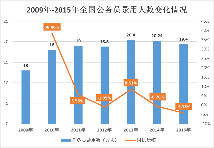 公务员录用人数方面,人社部公报数据显示,从2009年到2015年,全国共录用公务员人数分别为13万余人、18万余人、19万余人、18.8万人、20.4万人、20.24万人、19.4万人。其中,2014年、2015年连续两年下降。