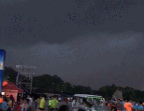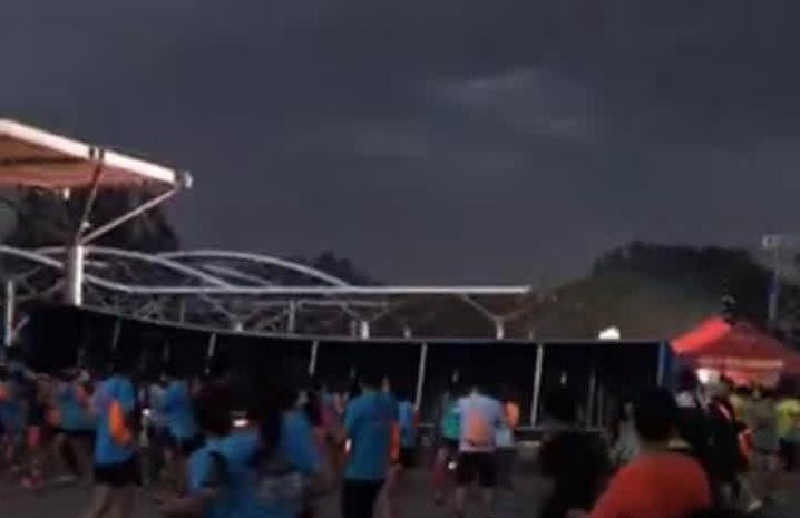 根据网友提供的一段现场视频显示,当时奥森公园内天色暗沉,有大风刮起,画面左侧、包裹着蓝色塑料广告布的“拱门”瞬间倒塌,砸向地面。画面显示,事发当时“拱门”周围有不少人聚集。