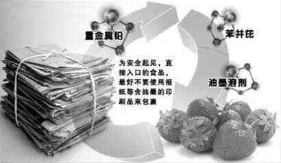 油墨中含有炭黑,炭黑含有几种致癌性多环芳烃,尤其苯并芘的含量较高。有些食品包装纸的油墨未干时,炭黑里的多环芳烃可以直接污染食品。很多人喜欢用报纸包着草莓、大白菜等保鲜,这样会接触到苯并芘,对健康不利。