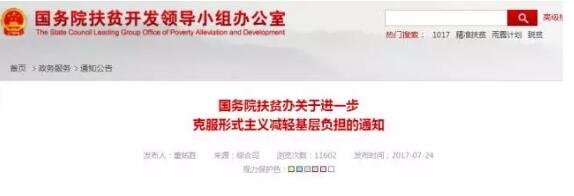 《国务院扶贫办关于解决扶贫工作中形式主义等问题的通知》(国开办发〔2016〕32号)印发后,各地认真贯彻落实,取得一定成效。但必须看到,扶贫领域形式主义问题依然突出,一些地方还有新的表现。近段时间以来,各方面普遍反映,频繁填表报数、迎评迎检、陪会参会等耗费了基层干部大量精力,干扰了脱贫攻坚工作,影响了党和政府形象,必须坚决制止。为贯彻中央纪委扶贫领域监督执纪问责工作电视电话会议精神,落实国务院扶贫开发领导小组的指示要求,现就有关问题通知如下:
