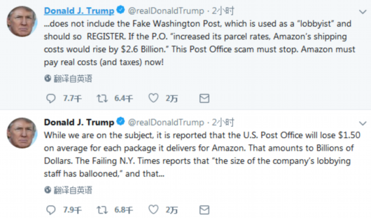 特朗普在推特上表示,美国邮政局每替亚马逊寄送一个包裹,就会平均损失1.50美元。总计达数十亿美元。特朗普还表示,贝佐斯(亚马逊首席执行官)旗下的《华盛顿邮报》报道假新闻,并被贝佐斯当作其政策的游说工具。如果美国邮政局提高了包裹费率,亚马逊的运输成本将增加26亿美元。亚马逊现在必须支付真实的成本和税收。