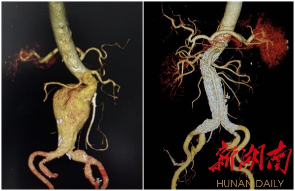 (图左:患者术前腹主动脉CT影像 图右:患者术后腹主动脉CT影像)