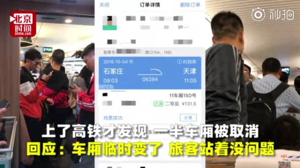 另据@北京时间消息,10月4日,石家庄有网友爆料从石家庄至天津的G6284次列车临时取消了9-16车厢,有一半人在站着,该旅客表示未接到提前通知,车长曾尝试增加车厢但未成功。列车工作人员表示超员也有超员率,只要在范围内站着没有问题。