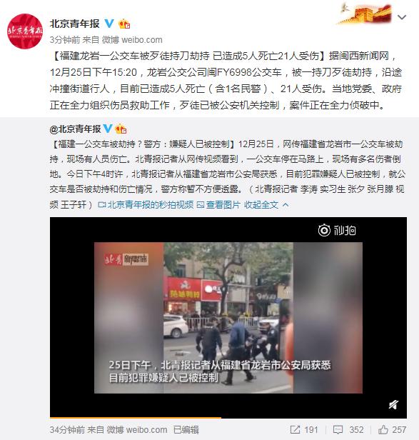 2018年12月25日下午15:20,龙岩公交公司闽FY6998公交车,被一持刀歹徒劫持,沿途冲撞街道行人,目前已造成5人死亡(含1名民警)、21人受伤。当地党委、政府正在全力组织伤员救助工作,歹徒已被公安机关控制,案件正在全力侦破中。详细情况待后续报道。