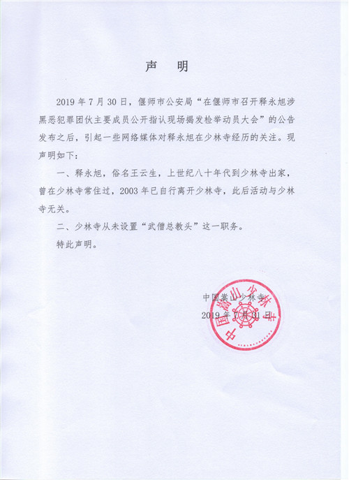 新京报快讯 据少林寺官网消息,近日,河南偃师警方拟举行现场动员大会,对以“前少林寺僧人”释永旭为首的涉黑恶犯罪团伙进行检举揭发事件引发关注。7月31日,少林寺官方对此作出回应,称释永旭2003年已自行离开少林寺,此后活动与少林寺无关,且少林寺从未设置“武僧总教头”这一职务。