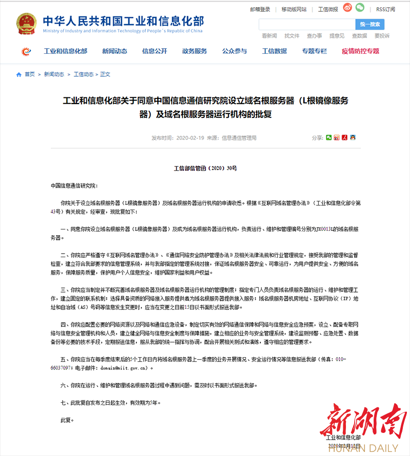 华声在线2月20日讯(新湖南客户端·华声在线记者 姚茜琼)昨日,工信部发函,宣布同意中国信息通信研究院设立域名根服务器(L根镜像服务器)及域名根服务器运行机构,负责运行、维护和管理编号分别为JX0013L的域名根服务器。