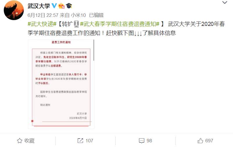 13日,中国地质大学 (武汉)、武汉学院等武汉高校发布通告:免收全日制本科生、研究生2020年春季学期住宿费,对于已缴纳的2020年春季学期住宿费予以全额退费。12日晚,武汉大学 通过官微发布关于2020年春季学期住宿费退费工作的通知,全额退还全日制本科生、研究生住宿费。有些高校尚未发布公告,但正在积极研究布置退还住宿费工作。