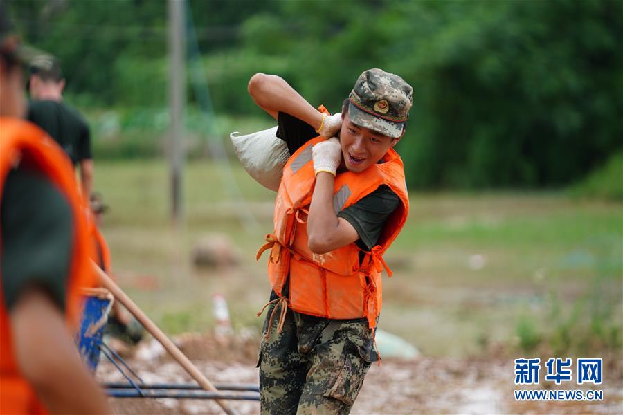武警战士在江西省鄱阳县鄱阳镇江家岭村搬运沙袋(7月11日摄)。新华社记者 周密 摄