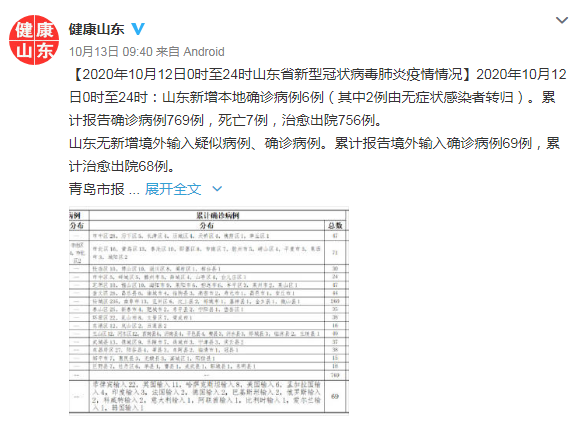 2020年10月12日0时至24时:山东新增本地确诊病例6例(其中2例由无症状感染者转归)。累计报告确诊病例769例,死亡7例,治愈出院756例。