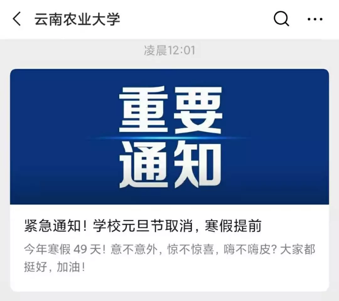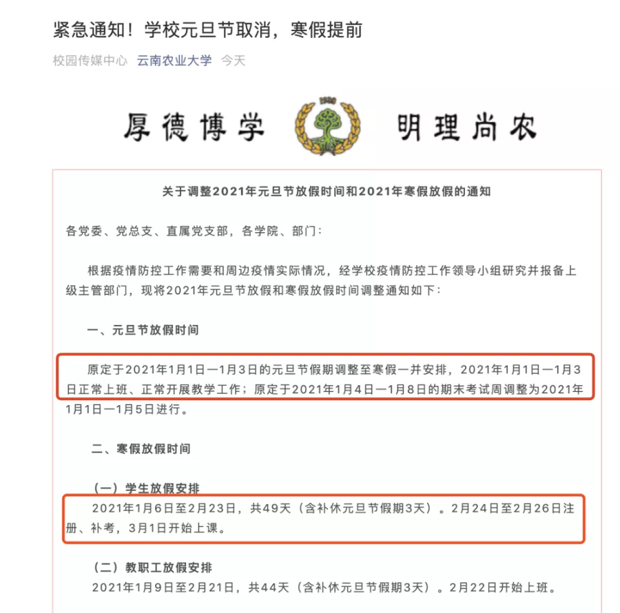 12月27日,云南农业大学发紧急通知,调整2021年元旦节放假时间和2021年寒假放假时间。