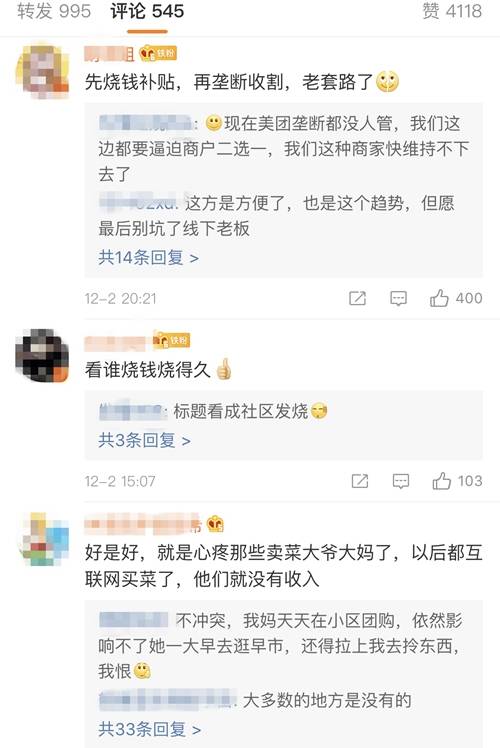 还有不少网友担心,“把卖菜的小商贩全干掉,以后菜价是不是就可以随便涨了?”“垄断以后就是涨价,你看现在外卖价格,没有三五十元,你能吃到干净像样的外卖?”