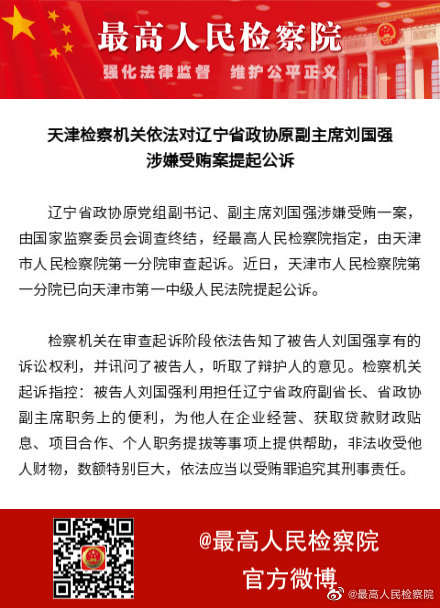 检察机关依法对辽宁省政协原副主席刘国强涉嫌受贿案提起公诉