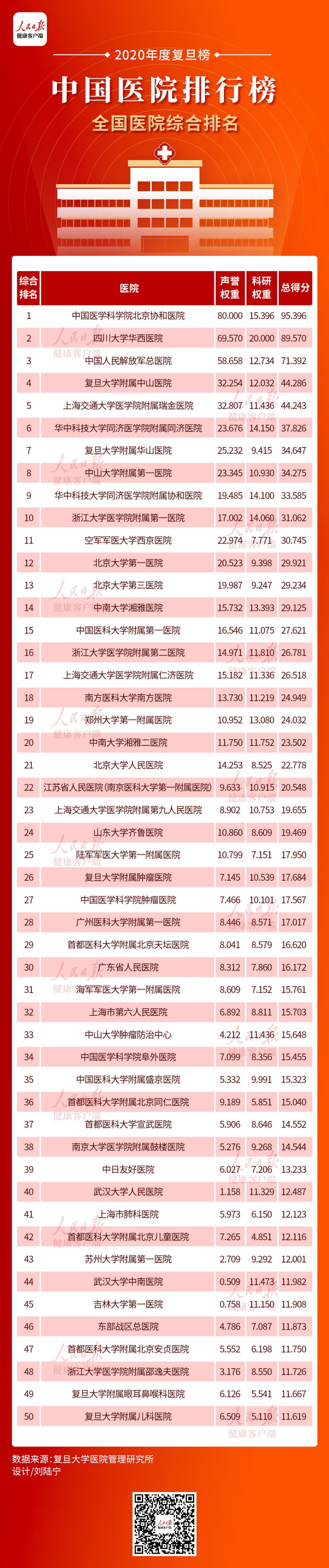 11月20日下午,复旦大学医院管理研究所在上海发布复旦版《2020年度中国医院综合排行榜》和《2020年度中国医院专科声誉排行榜》。全国共有100家医院进入“复旦版中国医院综合排行榜”,专科声誉排行榜中设置了42个专科。这是复旦大学医院管理研究所作为独立第三方连续第十二年发布医院排行榜。